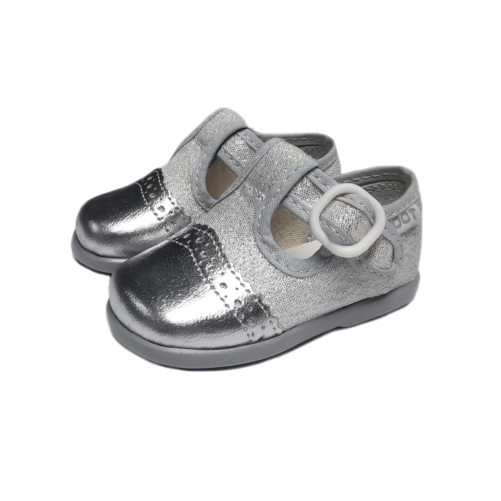 Guillermina clásica con hebilla y puntera picada en Lurex metalizado . Suela flexible Primeros caminantes