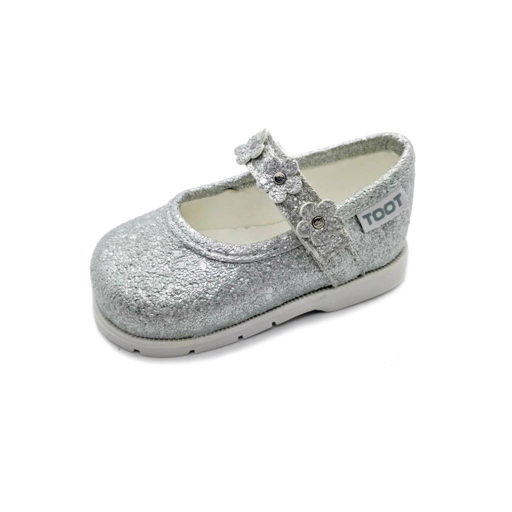 Guillermina clásica en eco cuero con abrojo y aplique de flores. Suela liviana Ideal para comunión y fiestas